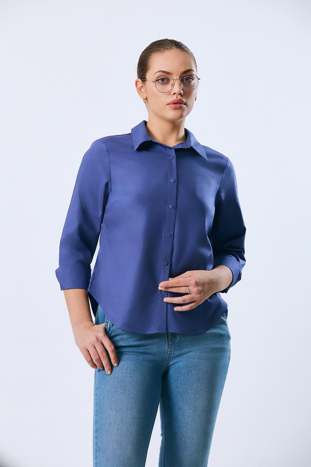 The model is wearing a button-down shirt. It features a classic collar and full-length sleeves.The shirt has a relaxed fit with a curved, high-low hem.