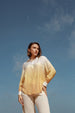 The shirt's standout detail is its ombre color effect, which transitions smoothly from a crisp white at the collar and cuffs to a vibrant, sunny yellow across the body. This gradient creates a visually striking and modern look. The design includes a full button-down front, a classic collar, and long sleeves with fitted cuffs, adding a touch of structure to its relaxed silhouette. It's a versatile piece that pairs well with the neutral trousers shown or can be styled with shorts or a skirt for a variety of casual occasions.