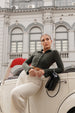 Pants: These are high-waisted, wide-leg trousers in a creamy off-white , beige colors . The fabric drapes beautifully, suggesting a high-quality material like linen or a fine wool blend. The wide-leg silhouette is both sophisticated and comfortable, and the neutral color makes them a versatile piece for an "old money" office wardrobe.