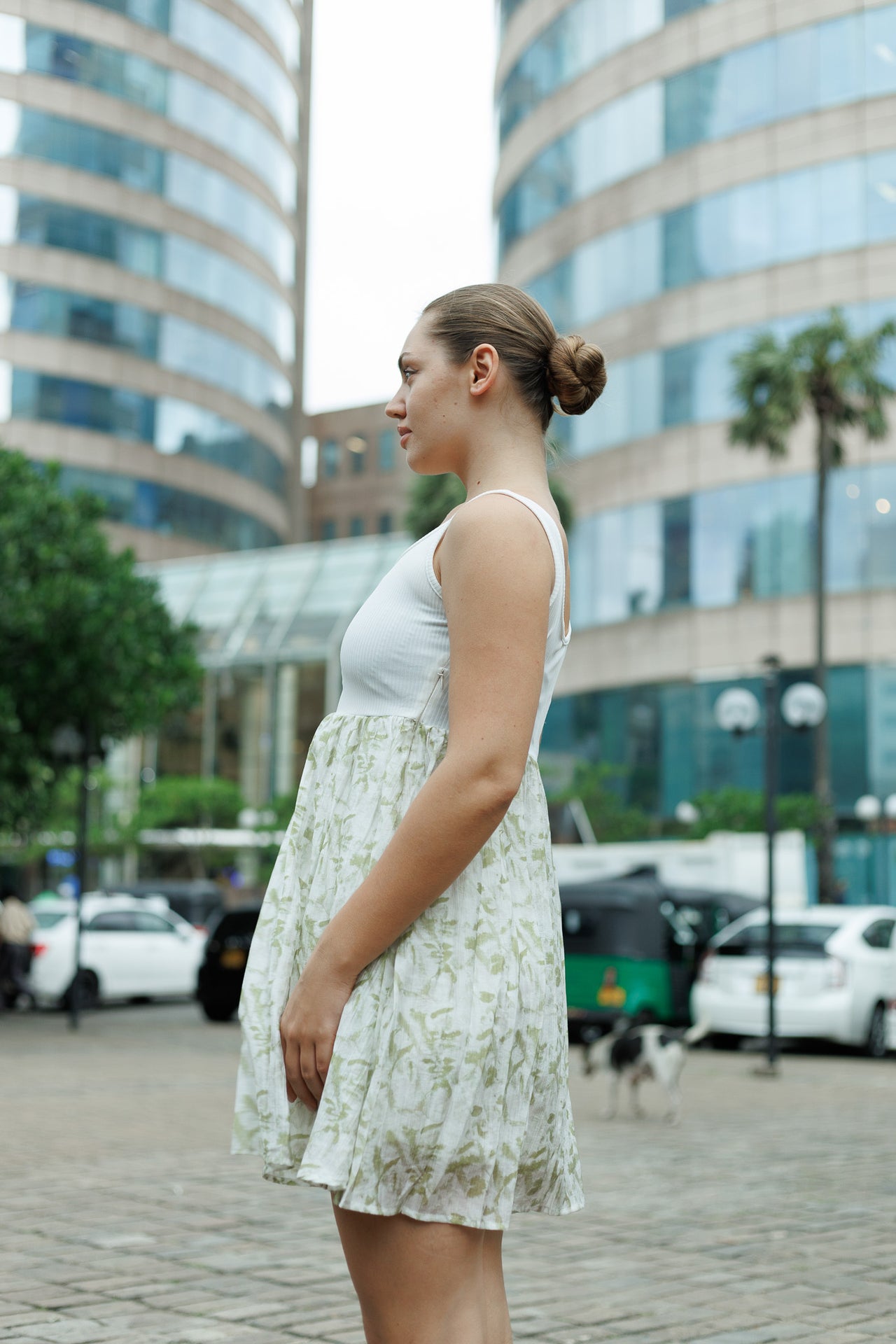 This dress is a comfortable mini-length dress that cleverly combines two distinct styles: a fitted tank top and a flowing skirt. The color palette is clean white contrasted with a light green print.
