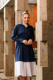 Embrace polished sophistication with this elegant Color-Block Shirt Dress, a versatile piece that seamlessly blends professional structure with relaxed movement. This dress features a striking two-tone design, with a rich navy blue dominating the tailored upper portion and a crisp white panel forming the flowing lower skirt. The classic shirt dress silhouette includes a sharp collar, a full button-down front, and long sleeves, offering a timeless, refined look.