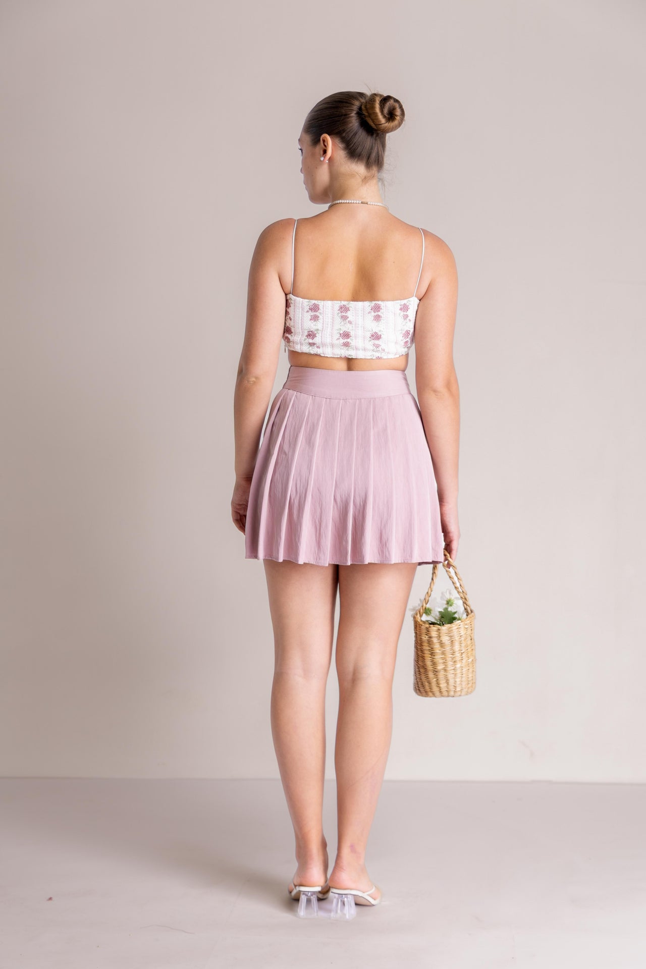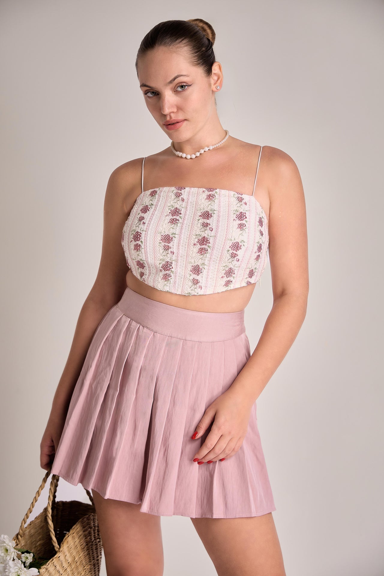 The Julianna Bodice is a sophisticated cropped piece featuring delicate, ultra-thin straps and a structured, corset-inspired silhouette that terminates in a graceful curved hem. The top is defined by a charming pattern of vertical stripes interspersed with dainty floral clusters, crafted from a lightweight yet firm material that maintains its tailored shape throughout.