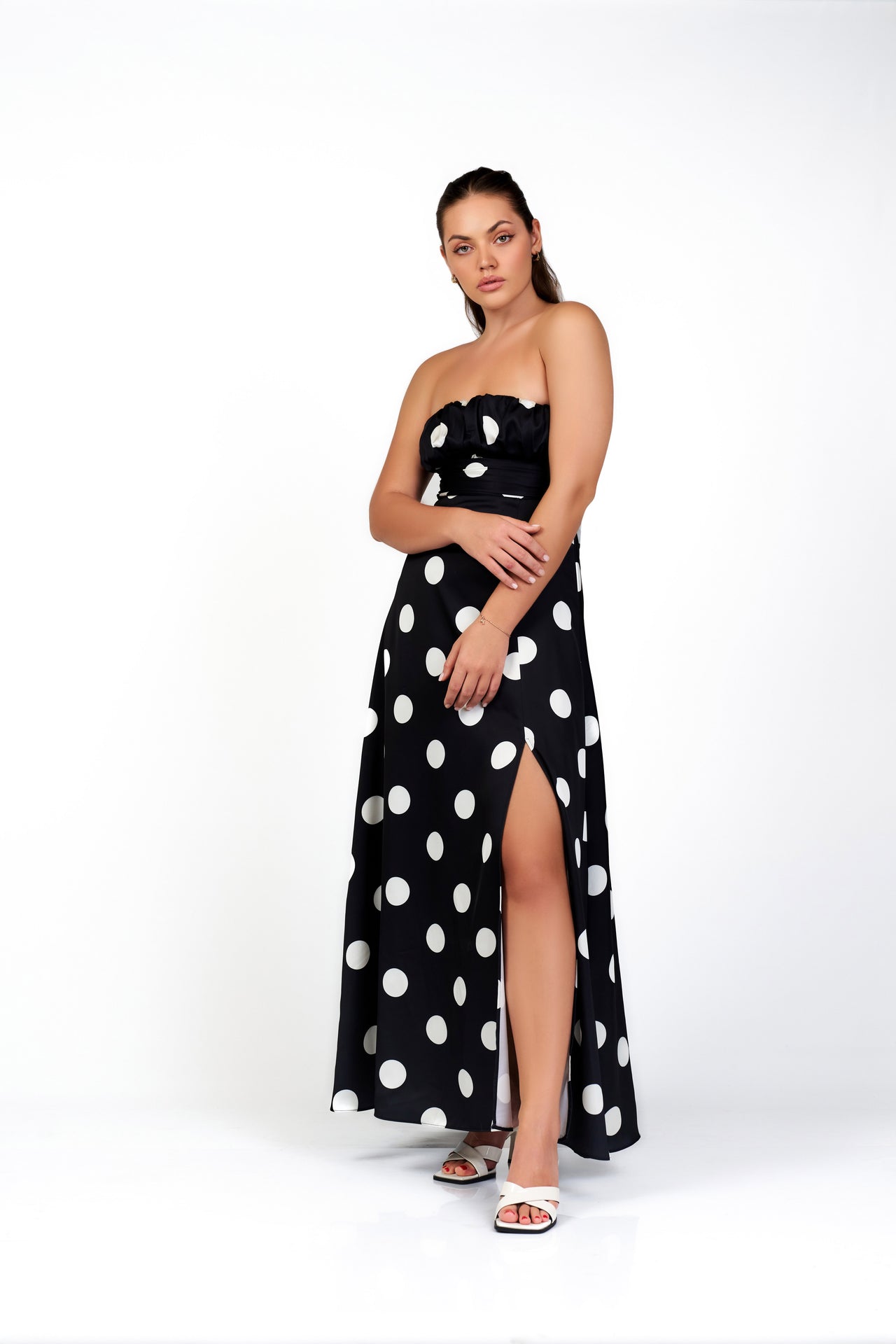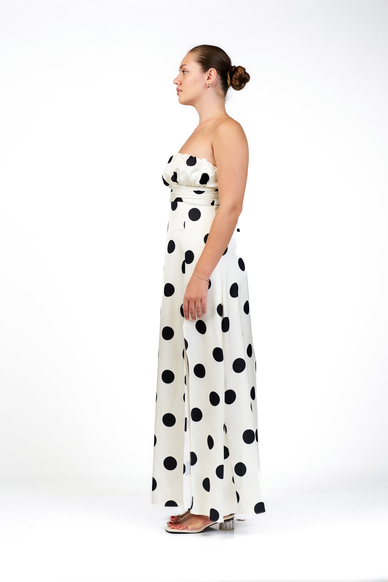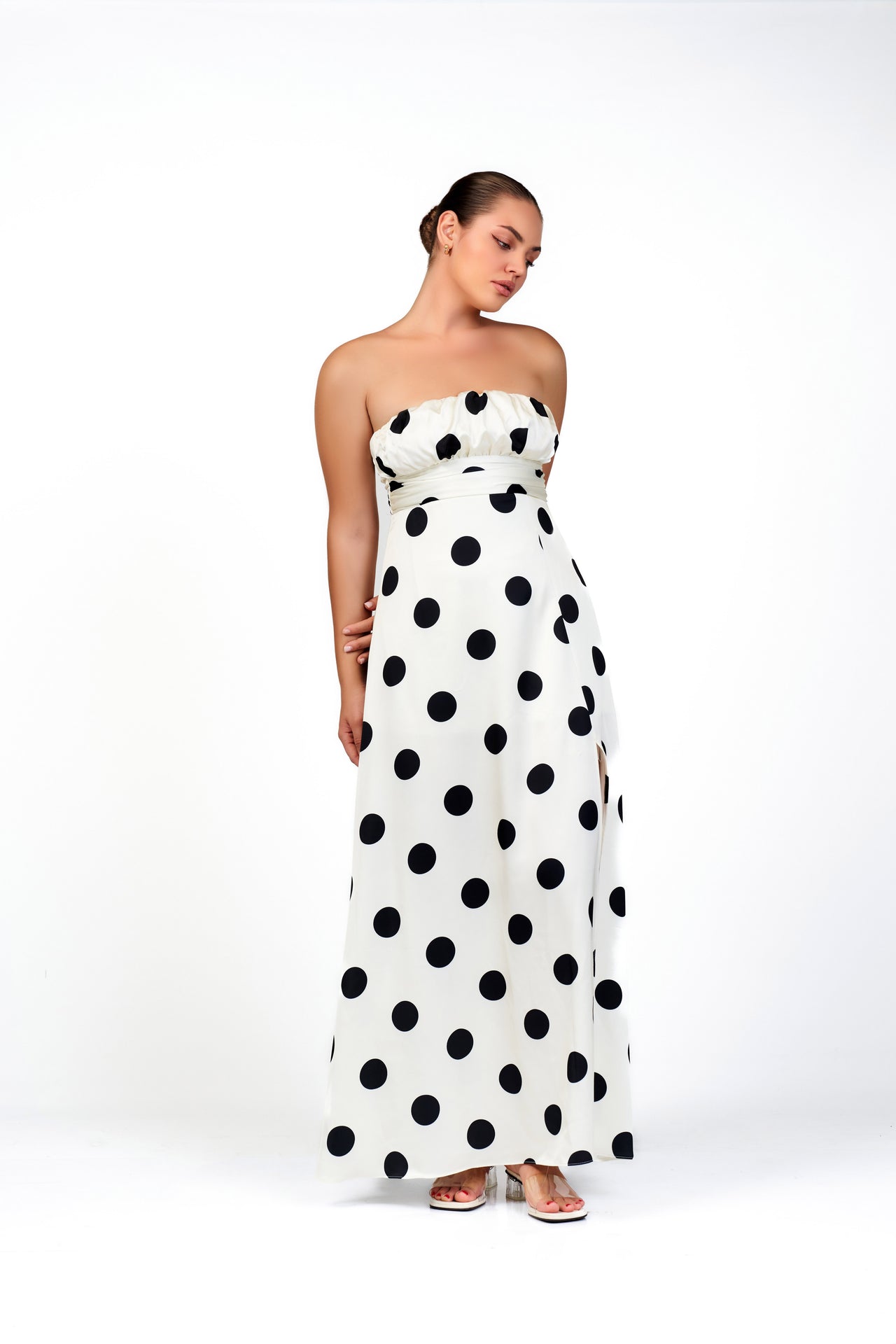 This striking strapless gown features a bold, oversized polka-dot print for a high-fashion, retro-inspired look. The design is defined by a sculptural, gathered bodice and a sleek empire waist that flows into a floor-length skirt. A daring thigh-high slit adds a modern, sophisticated edge to this timeless silhouette.