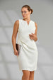 This refined knee-length dress blends clean tailoring with a soft, feminine silhouette. It features a subtle V-neck wrap-style bodice that enhances the neckline and creates an elegant, elongating effect. The gently ruched short sleeves add volume and charm while maintaining a polished finish. Expertly shaped at the waist, the dress contours the figure and falls to a sleek, streamlined hem for a sophisticated look. Crafted from a smooth, comfortable fabric, it offers ease of movement and all-day wearability. Perfect for work, daytime events, or refined casual outings, this piece delivers effortless elegance with minimal effort.