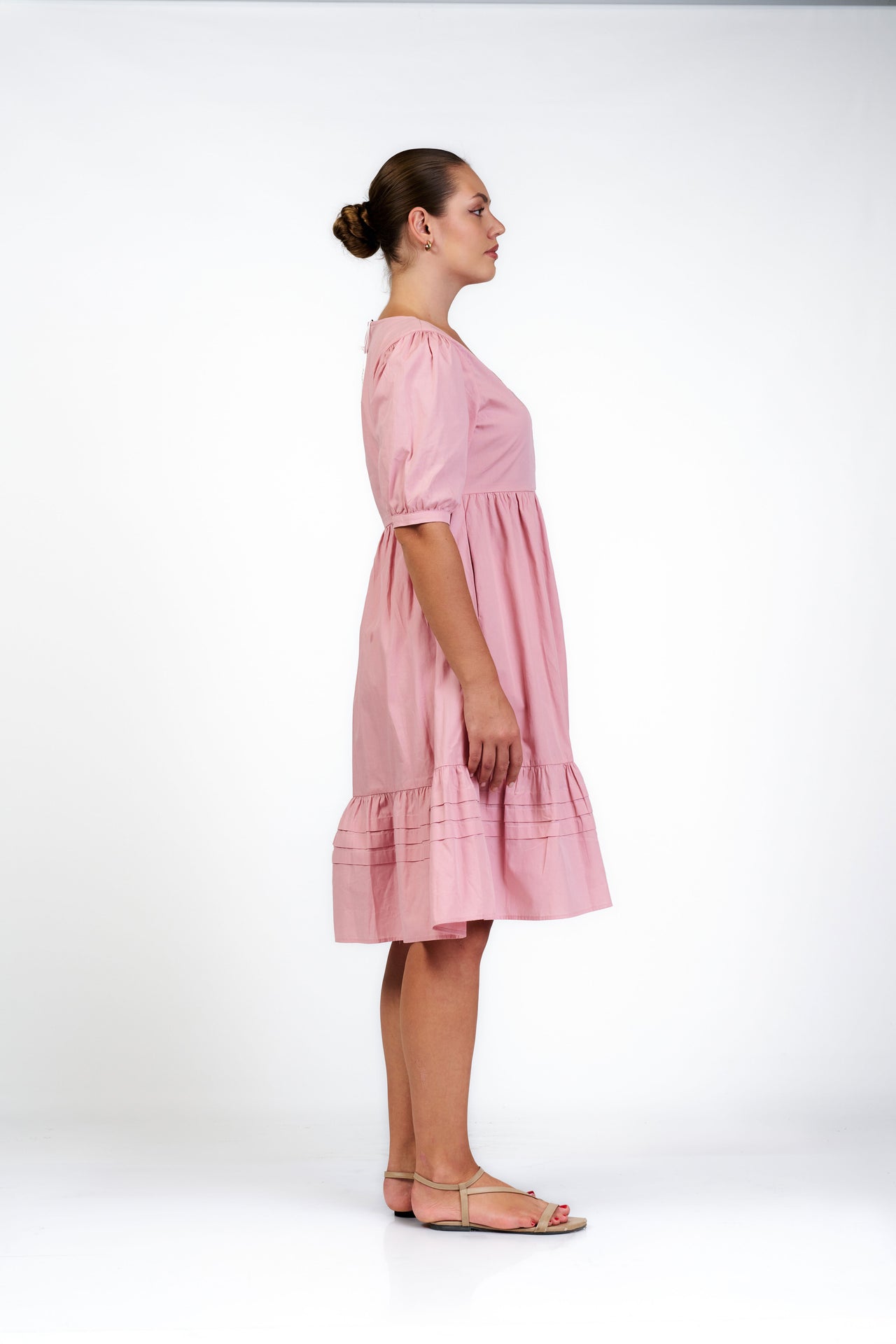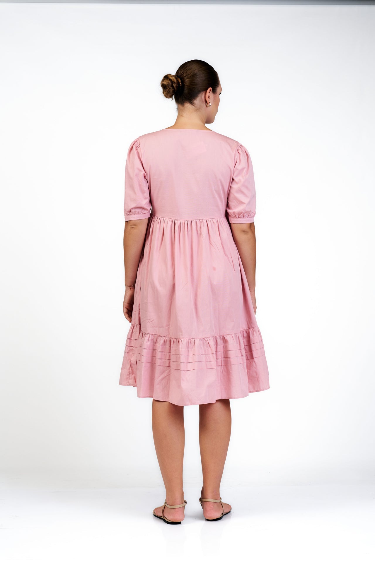 This romantic piece features a soft V-neckline and delicate puff sleeves, exuding feminine charm. The high-waisted, gathered bodice flows into a tiered skirt accented with fine horizontal pintuck details. Its knee length silhouette and button-front design offer a graceful, timeless aesthetic for any daytime occasion.