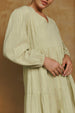 This dress is a relaxed, mini-length smock dress in a soft, refreshing pale lime or pistachio green color. The material has a lightweight, slightly textured feel and features subtle, woven vertical stripes throughout, which adds a gentle dimension to the color.