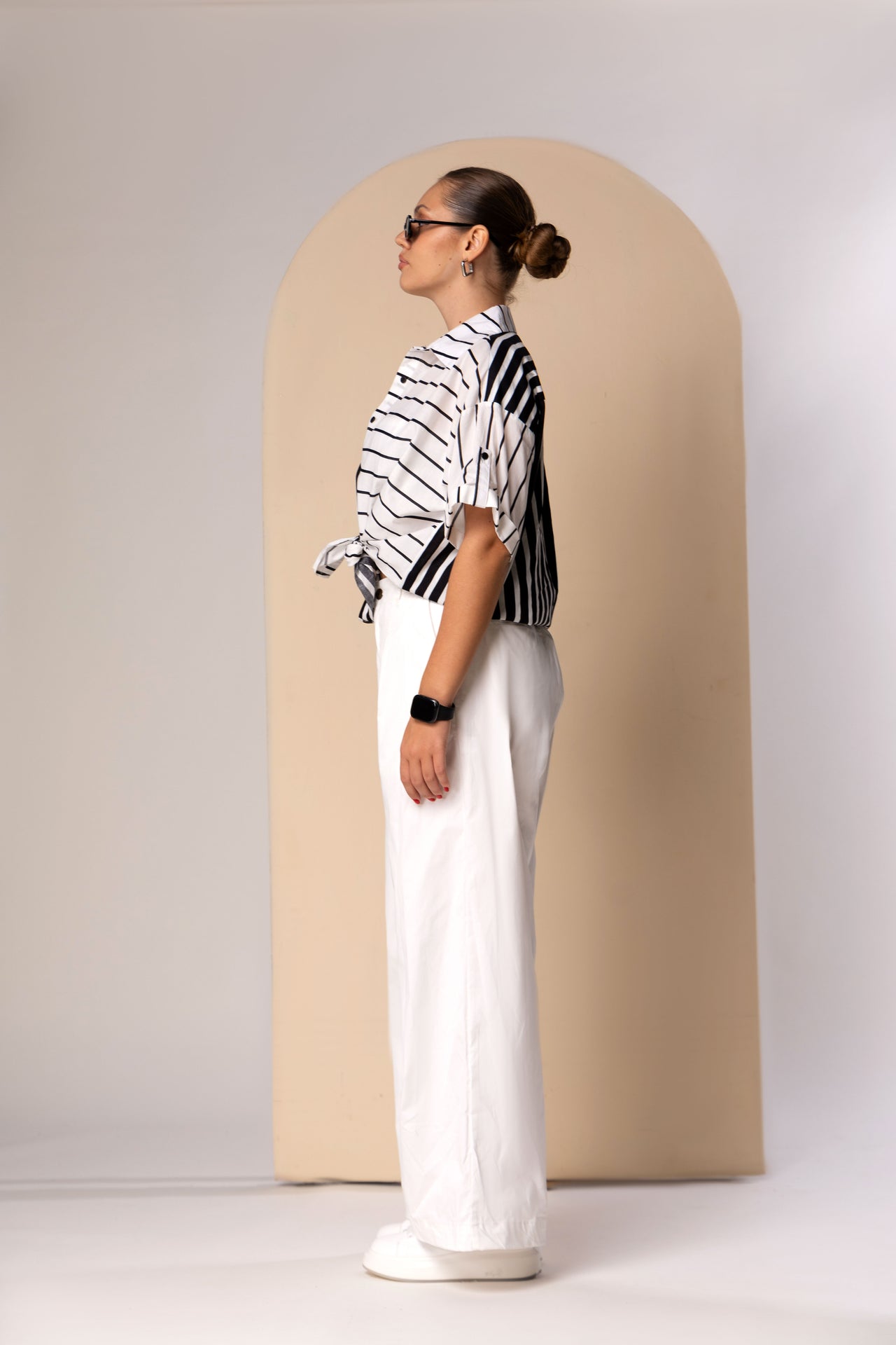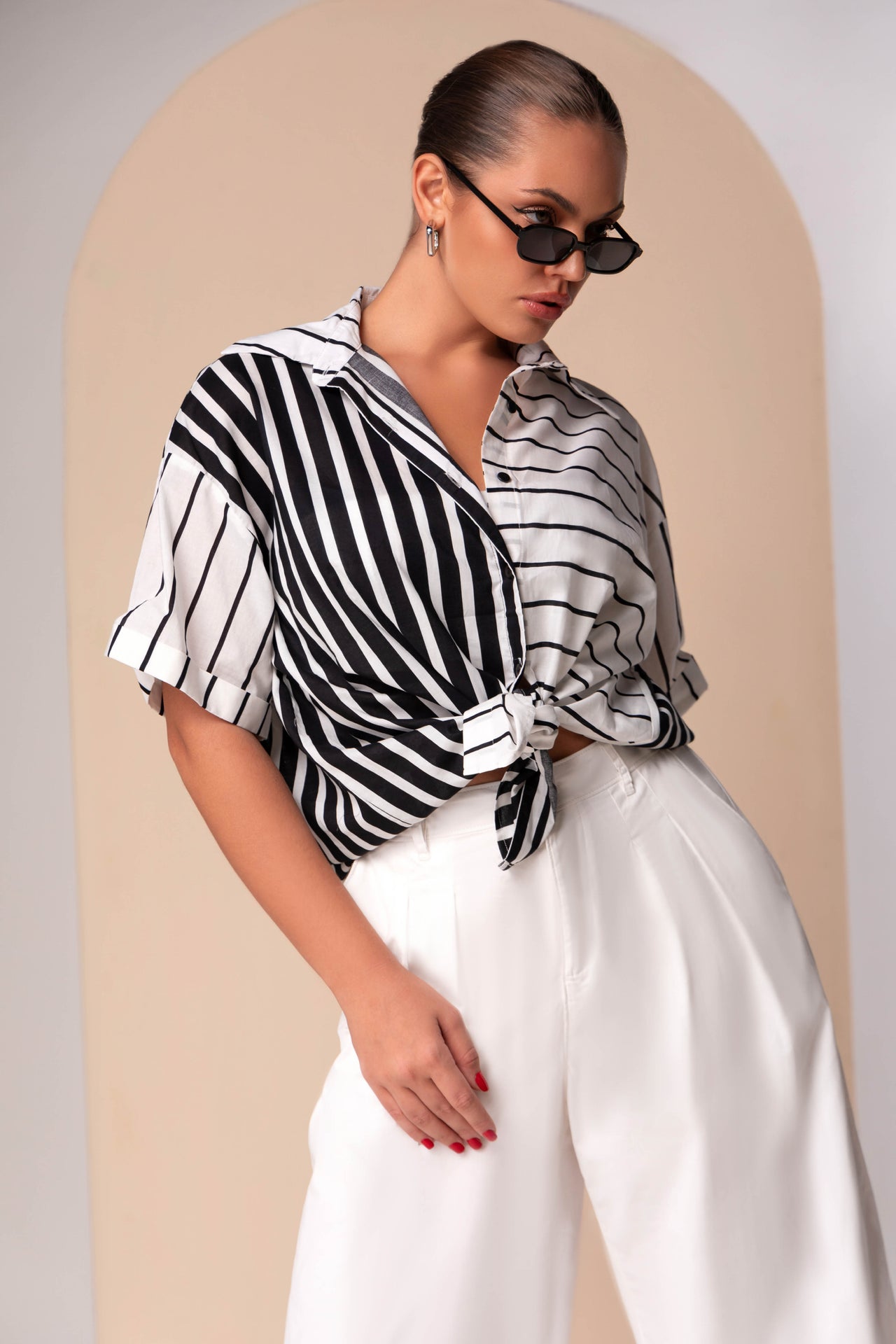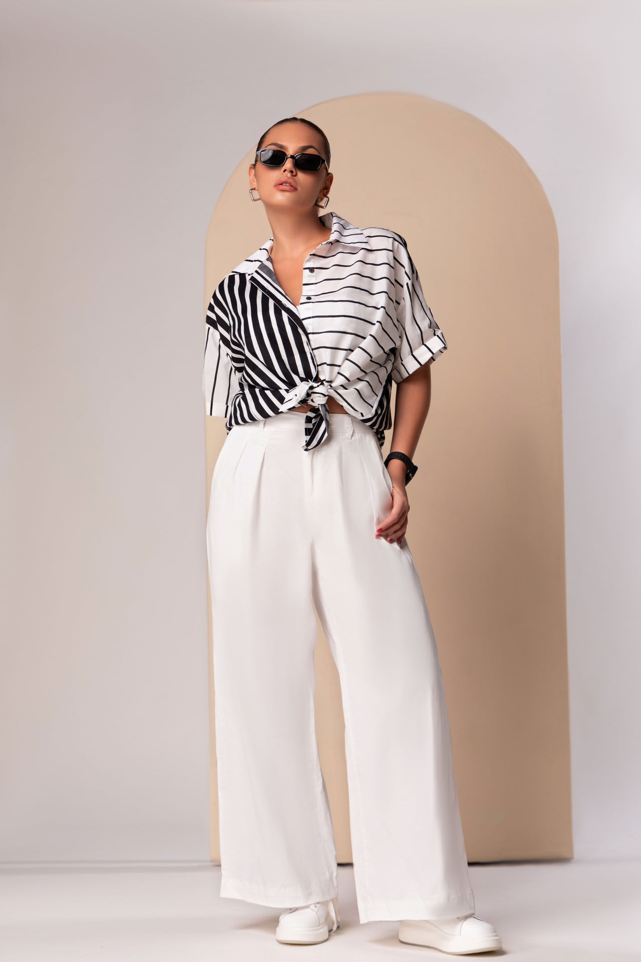 By styling the top with an intentional front-knot over a structured, white-knit mini skirt and matching bandeau, the outfit achieves a balanced play between volume and form-fitting tailoring. The use of traditional pinstripes—a staple of formal shirting—grounds the relaxed, drop-shoulder silhouette in a professional context, making it a refined alternative for business-casual settings. This narrative is further elevated by amber-tinted rectangular frames and sleek grooming, creating a polished, "Jetset-Chic" uniform designed for the modern professional who values lightweight comfort and a high-end, transitional wardrobe.